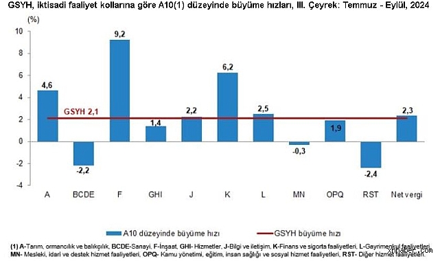 Türkiye İstatistik Kurumu (TÜİK), 2024 yılının üçüncü çeyreğine ilişkin büyüme rakamlarını açıkladı. Gayrisafi yurt içi hasıla (GSYH), zincirlenmiş hacim endeksi olarak, bir önceki yılın aynı dönemine göre yüzde 2,1 oranında arttı.Sektörel Performanslar: