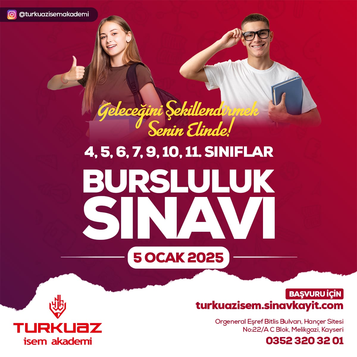 Turkuaz İsem Akademi Yönetim Kurulu Başkanı Eğitimci Hacı Mehmet Muhtar, sınav öncesi yaptığı açıklamada, “Geleceğimizin teminatı olan çocuklarımız için büyük bir heyecanla bursluluk sınavı düzenliyoruz. Bu sınav, öğrencilerimizin hayallerine giden yolda önemli bir adım olacak. Turkuaz İsem Akademi ailesi olarak, eğitimde fırsat eşitliği yaratmayı amaçlıyoruz. Tüm gençlerimizi bu önemli sınava davet ediyoruz. Ayrıntılı bilgi almak isteyenler 0352 320 32 01 numaralı telefondan bize ulaşabilirler,” ifadelerini kullandı.Bursluluk sınavı, öğrencilerin gelecekteki başarılarını şekillendirecek önemli bir adım olarak görülüyor. Eğitimde fark yaratmak isteyen öğrenciler, Turkuaz İsem Akademi’nin bu fırsatını kaçırmamalı.