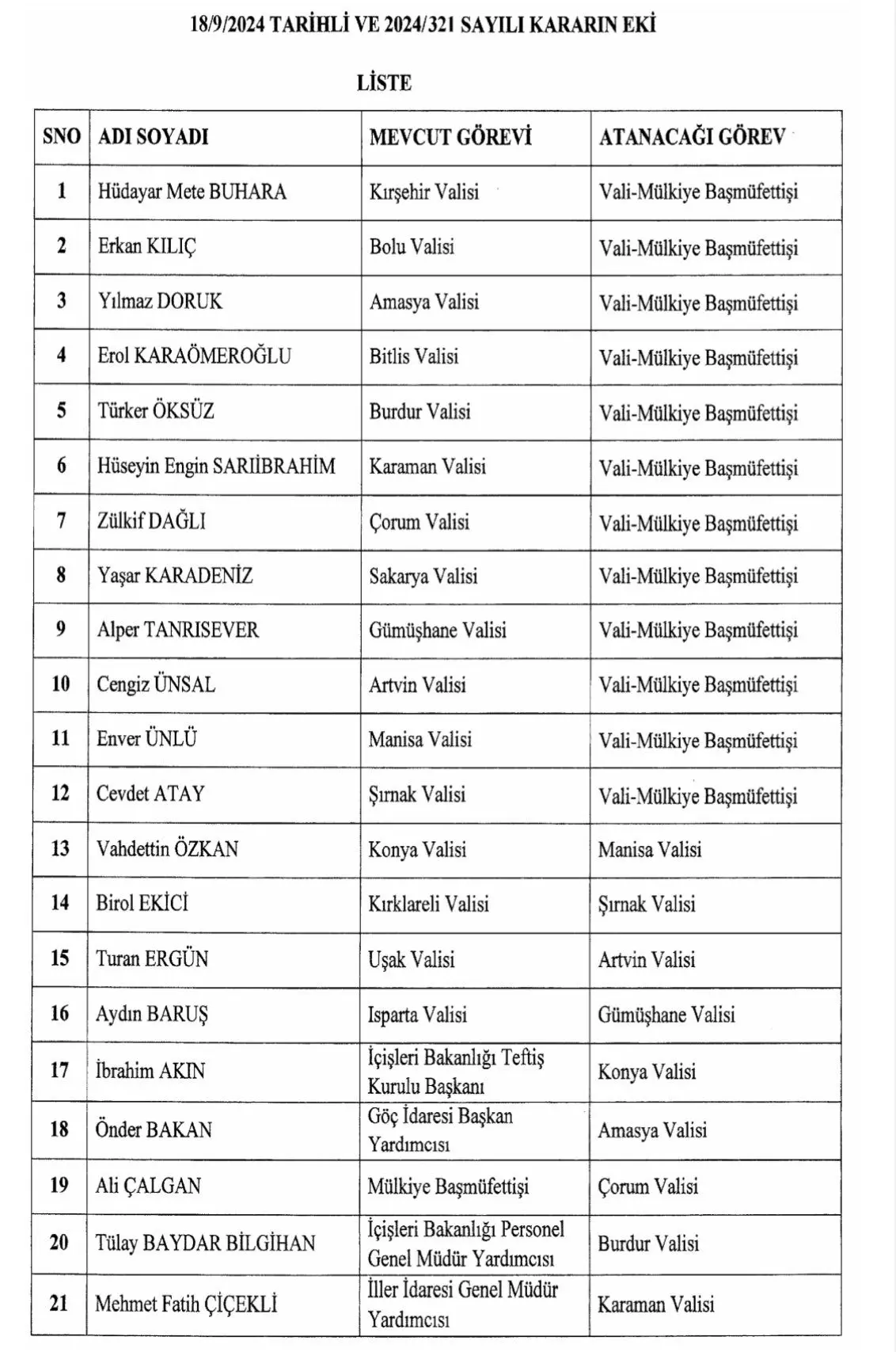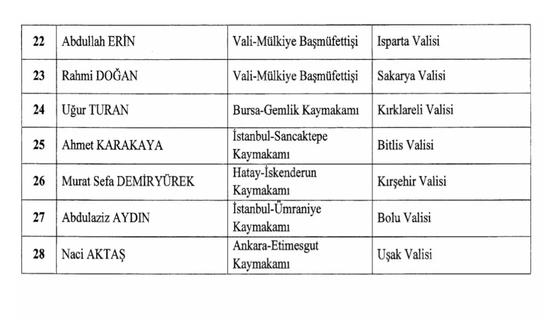 Cumhurbaşkanlığı tarafından yapılan atamalar hakkında kararlar Resmi Gazete'de yayımlandı.Cumhurbaşkanı Recep Tayyip Erdoğan imzasıyla yayımlanan karara göre, 12 ilin valisi mülkiye müfettişi oldu. 16 ilin valisi değişti.Kahramanmaraş merkezli 6 Şubat depremlerinde Hatay Valisi olan Rahmi Doğan, Sakarya Valisi oldu.İşte Yeni Atanan 16 ile Vali olarak atanan o isimler: