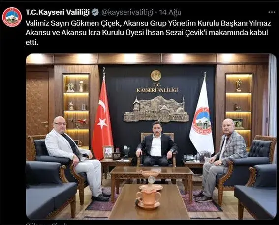 Öte yandan, İcra Kurulu Üyesi İhsan Sezai Çevik’in hatıra fotoğrafı sırasında elini arkasına atarak verdiği poz, devlet protokolü açısından büyük tepki çekti. Özellikle resmi bir ziyaret sırasında, hele ki bir devlet valisinin makamında sergilenen bu duruşun “saygı sınırlarını aştığı” yorumları yapıldı.Tepkilerin bir diğer odak noktası ise bu ziyaretin Valilik ve Vali Gökmen Çiçek’in sosyal medya hesaplarında hiçbir şekilde paylaşılmamış olmasıydı. Fotoğraf ve içerik yalnızca Yılmaz Akansu tarafından kamuoyuna servis edildi. Bu durum, ziyaretin içeriği, amacı ve paylaşım biçimiyle ilgili soru işaretlerini daha da artırdı.Daha önce FETÖ ile iltisaklı olduğu iddiaları kamuoyuna yansıyan Yılmaz Akansu’nun aynı ismi taşıyan torunu ile birlikte yaptığı bu ziyaretin bu denli tartışma yaratması, şirket yöneticilerinin kamu kurumlarına karşı takındığı tutumun yeniden sorgulanmasına neden oldu.Ziyaret için günlerce randevu bekledikleri öğrenilen Akansu Grup yöneticilerinin, bu kadar zahmetli geçen sürecin ardından kamuoyu nezlinde büyük bir hataya imza atması, yerel halkta ciddi rahatsızlık yarattı.Henüz Akansu Grup cephesinden konuyla ilgili bir özür açıklaması yapılmazken, gözler şimdi Yönetim Kurulu Başkanı Yılmaz Akansu’ya çevrilmiş durumda. Kayseri kamuoyu, bu ziyaretin ardından yaşanan saygı ihlallerine karşı açık ve net bir özür mesajı bekliyor.