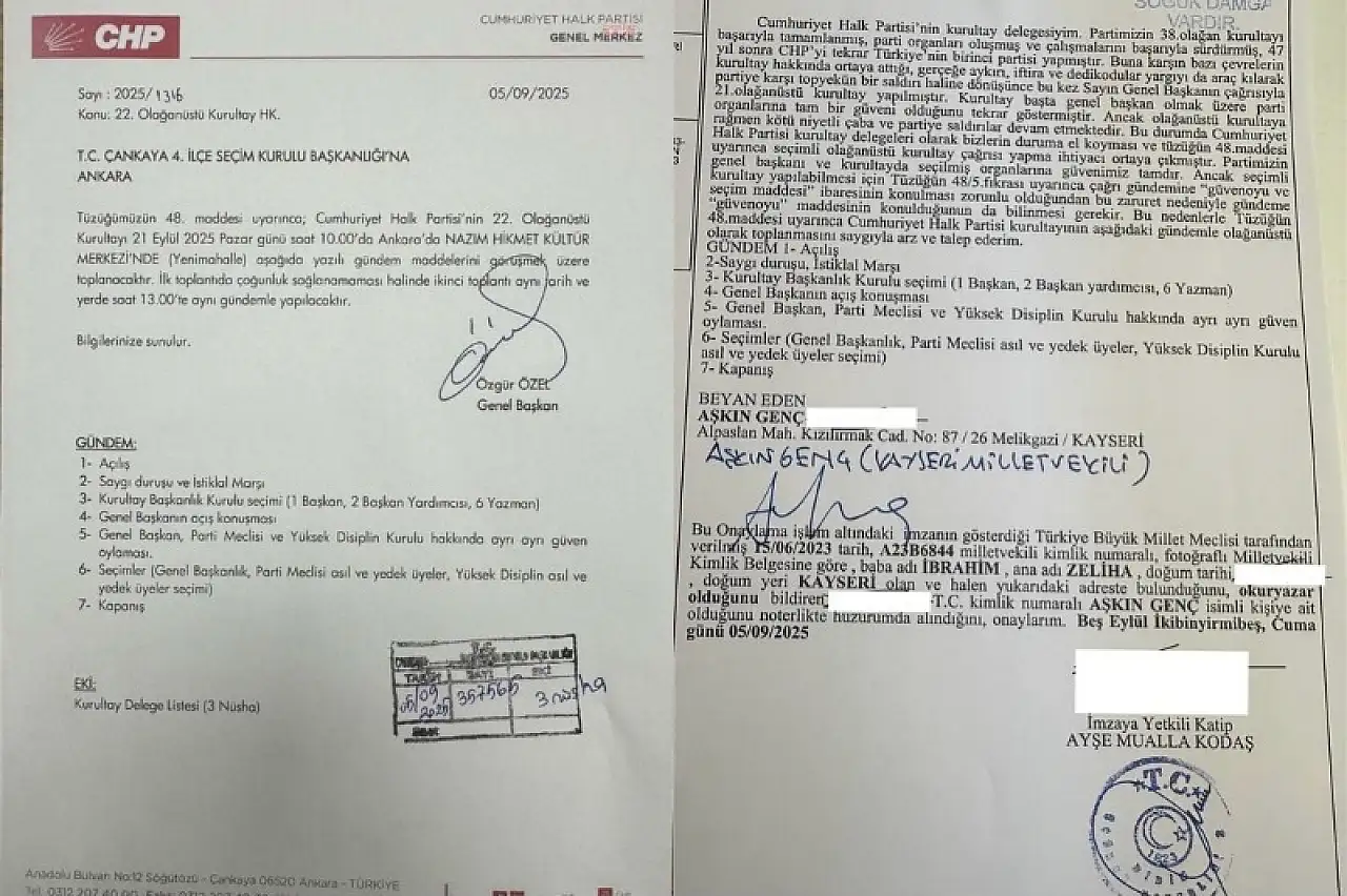 CHP Kayseri Milletvekili Aşkın Genç, partisinin 21 Eylül’de olağanüstü kurultay yapacağını duyurdu. Genç, sosyal medya hesabından yaptığı açıklamada noter huzurunda imza verdiklerini belirterek, “Cumhuriyet Halk Partisi’nde demokrasiyi, üyelerin iradesini ve örgütümüzün onurunu savunmak için olağanüstü kurultay çağrısına dün imzamızı attık” dedi.
