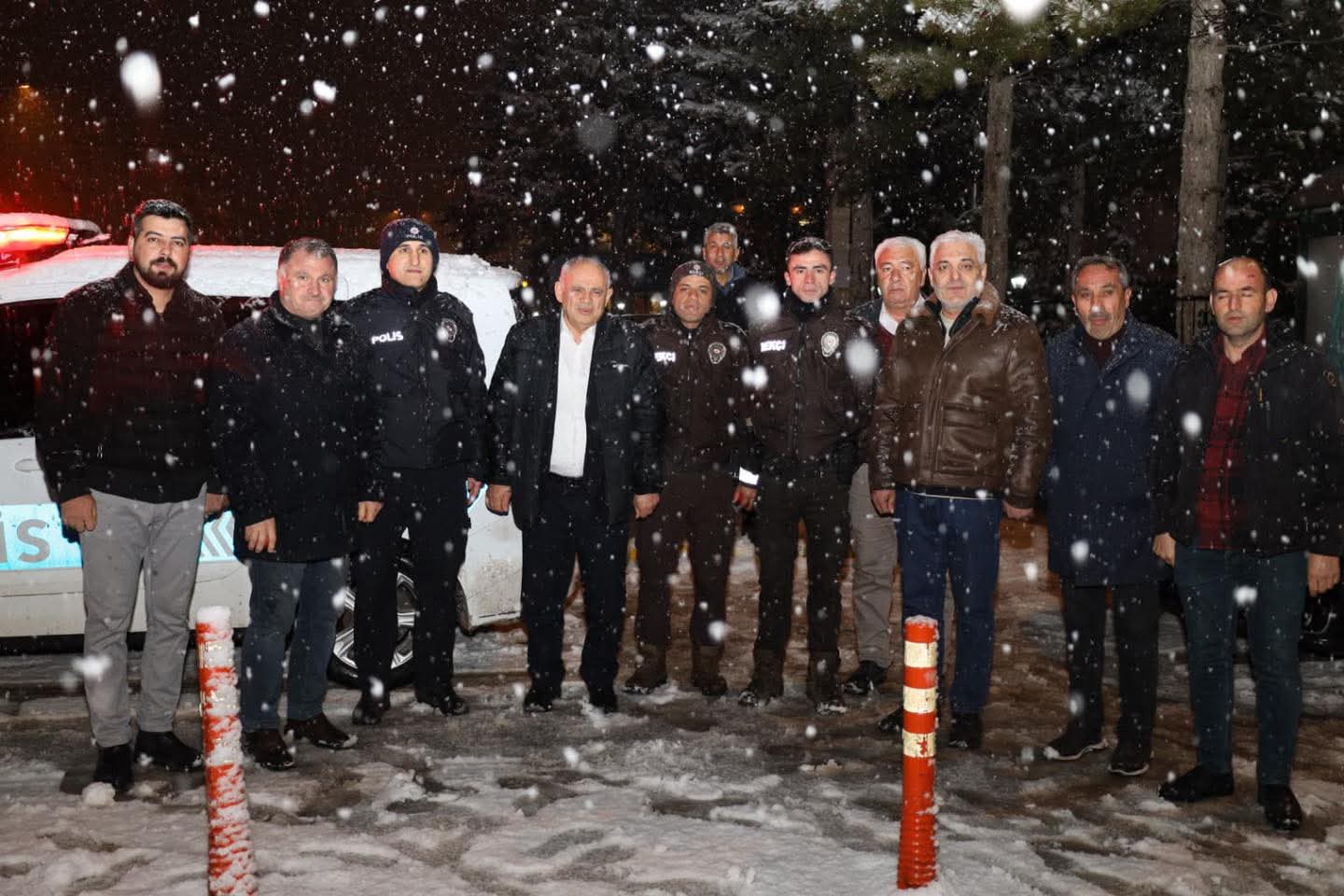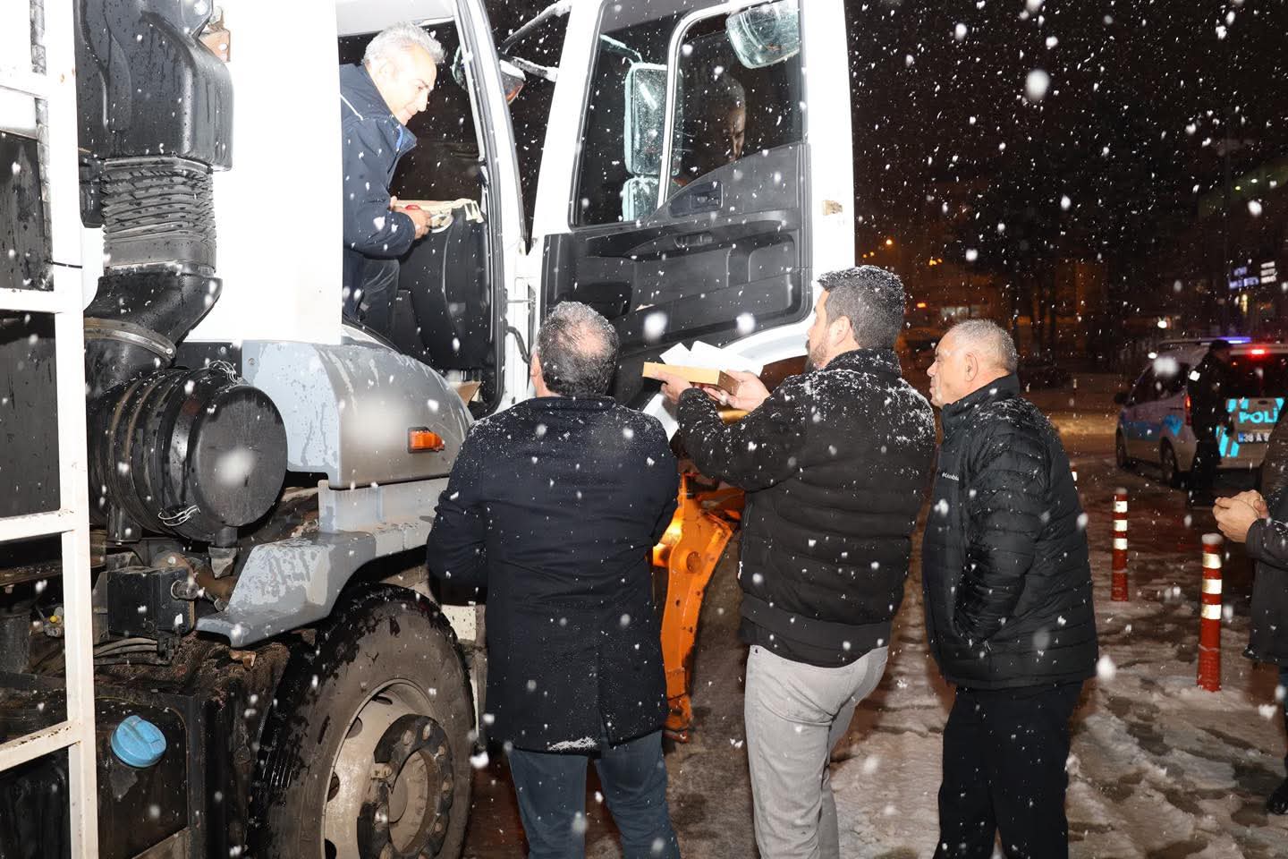 Yılbaşı gecesi etkisini artıran kar yağışı nedeniyle sahada çalışmalarını sürdüren karla mücadele ekipleri de ziyaret edildi. Zorlu hava şartlarında gece boyunca görev yapan belediye personeline tatlı ikramında bulunulurken, Başkan Öztürk ekiplerle tek tek ilgilenerek özverili çalışmalarından dolayı teşekkür etti.